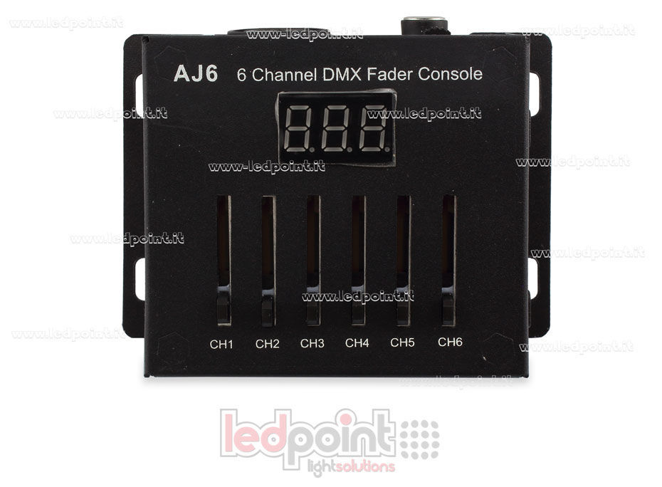 SYSTÈMES SKYDANCE CATALOGUE FAQ Console de fader Mini DMX 6 canaux. Convient aux installations permanentes utilisant les supports disponibles. Facile à utiliser, idéal pour les tests d'échantillons et le dépannage sur site ou en magasin. Alimenté par 3 piles AAA ou alimentation externe 5-12V. Affichage LED à 3 chiffres 0-100% ou DMX000 - DMX255 (réglages via le commutateur DIP interne). Mode 6 canaux ou 5 canaux et mode maître (réglages via DIP-Switch interne).