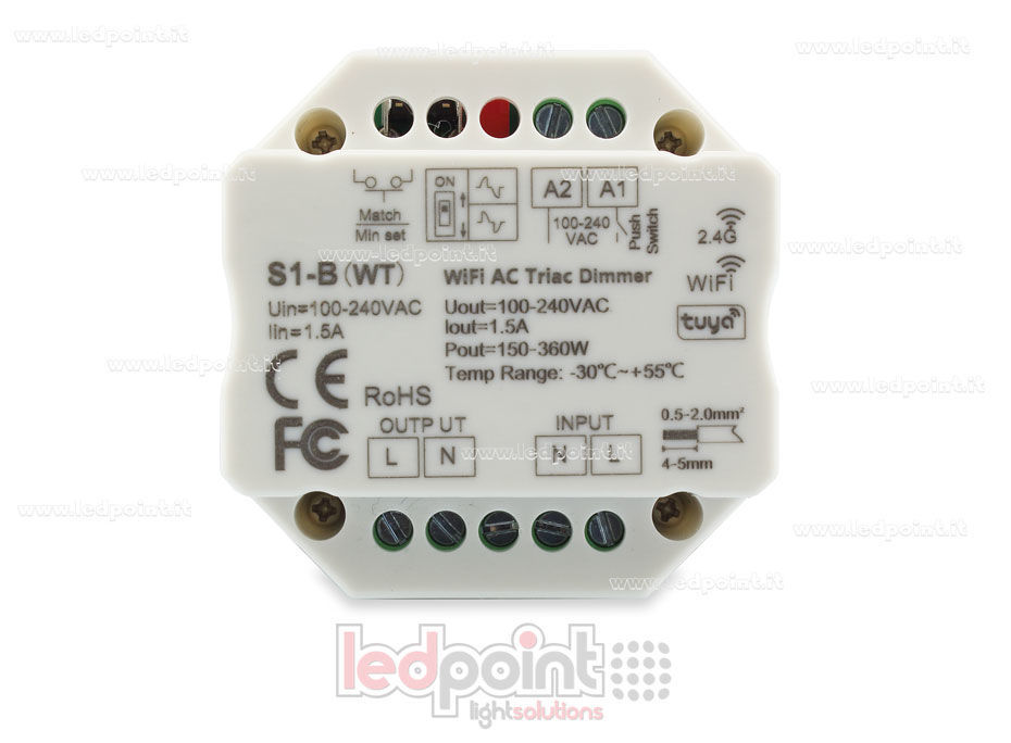 SYSTÈMES SKYDANCE CATALOGUE FAQ Contrôleur RF + Push AC à coupure de phase, sortie 1 canal max 1.5A. Idéal pour allumer / éteindre ou régler driver LED triac dimmables, les lampes à incandescence et halogènes traditionnelles. Peut être associé à toutes les télécommandes monochromes mono ou multizones. Il est possible de se connecter avec un interrupteur externe pour obtenir la fonction on/off et variateur. Facile à placer dans une boîte de jonction murale standard derrière un interrupteur à poussoir. Control cloud APP Tuya, on/off, réglage luminosité, retard on/off lumière, timer, reproduction scènes et musique.