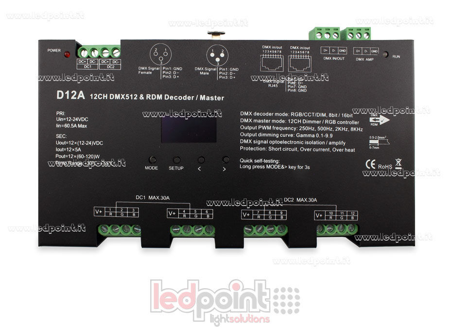 SYSTÈMES SKYDANCE CATALOGUE FAQ Décodeur DMX à tension constante, 12-24V, avec 12 canaux sélectionnables de 5A chacun. Fonctionnement simple avec écran OLED et 4 boutons. Mode de décodage DIM / CCT / RGB sélectionnable. Fréquence PWM 250/500/2000 / 8000Hz sélectionnable.