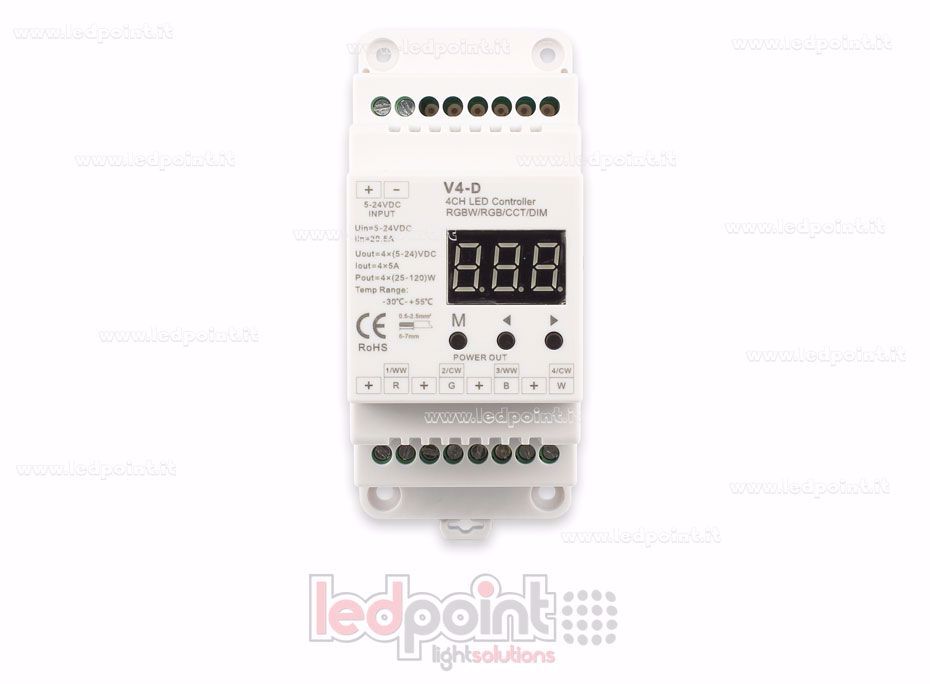 Récepteur contrôleur RF LED pour rail DIN 4 canaux RGBW, RGB, CCT et monochrome, associable aux télécommandes moncouleur, CCT, RGB et RGBW. Un contrôleur RF accept jusqu'au 10 télécommandes. Par l'écran numerique et la simple utilisation des boutons il peut être configuré comme variaterur 1 canal, 4 canaux, contrôleur CCT, RGB ou RGBW.
