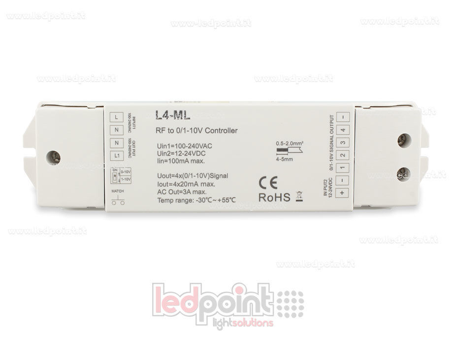 Dimmer RF à 0-10V à 4 canaux, alimenté par entré CA ou CC. Signal de sortie 0-10V à 4 canaux, pour régler drivers led dimmables 0/1-10V. Entrée AC haute tension. sortie relais AC haute tension. Sortie 0-10V ou 1-10V selectionnable par DIP switch. Associable avec tous les télécommandes RF monocouleur, CCT et RGB/RGBW. Un contrôleur RF accepte jusq'au 10 télécommandes.