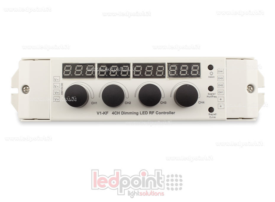 SYSTÈMES SKYDANCE CATALOGUE FAQ Gradateur RF monochromatique à tension constante avec régulation à 4 canaux, peut également être utilisé comme télécommande RF à 4 zones. Réglage via 4 boutons avec affichage numérique et touches. Il peut également être associé à toutes les télécommandes RF monochromes mono ou multi-zone.