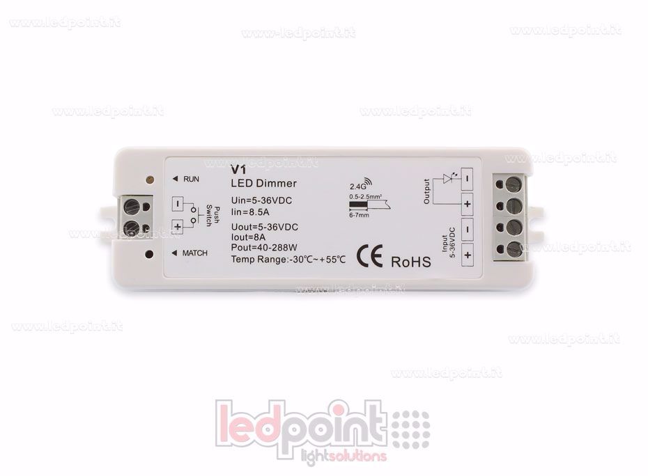 SYSTÈMES SKYDANCE CATALOGUE FAQ Récepteur dimmer LED 1 canal monochromatique, associable à toutes les télécommandes RF monochromatiques. Un contrôleur peut être associé jusqu'a 10 télécommandes. Il est possible de connecter un interrupteur externe pour avoir la fonction on/off et variateur.