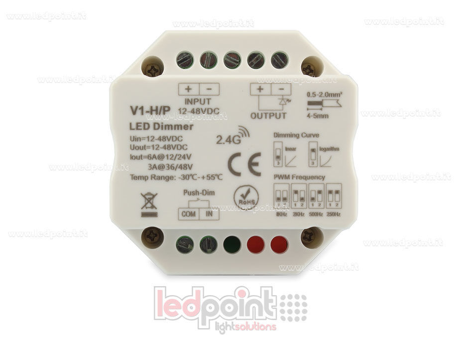 Récepteur variateur RF monochromatique 1 canal 8A à 12-24V ou 4A à 36-48V. Associable à toutes les télécommandes RF monochromatiques. Un contrôleur peut être associé à jusqu'à 10 télécommandes. Grâce aux faders des commutateurs DIP, il est possible de sélectionner la courbe de variation et la fréquence PWM Il est possible de connecter un interrupteur externe pour avoir la fonction marche/arrêt et variateur. Idéal pour être placé dans la boîte de jonction murale standard derrière un interrupteur à bouton-poussoir.