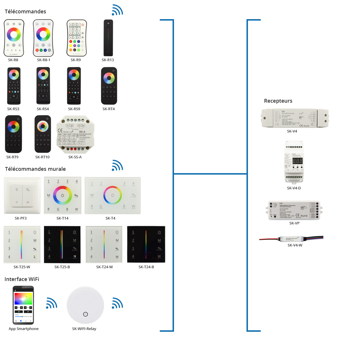 Le système de contrôle RGBW comprend récepteurs 4 canaux, télécommandes manuelles ou murales, appareils Wifi et amplificateurs de signal. Tous les récepteurs 4 canaux peuvent être utilisés pour contrôler rubans LED RGBW, RGB, CCT ou monocouleur. Chaque récepteur peut transmettre le signal à un autre récepteur dans un rayon de plus de 100 m et peut être associé à 10 télécommandes.