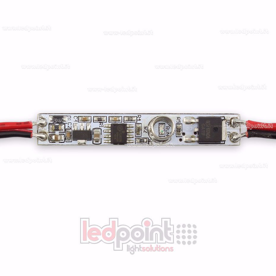 Gradateur tactile mini, monochromatique à tension constante, 1 canal. Fonctionnement tactile haute sensibilité avec indicateur led. 3A/canal, puissance de sorite maximale 72W à 24V. Idéal pour être inséré à l'intérieur du profilé aluminium, l'adhesiv double- face semplifie l'installation.