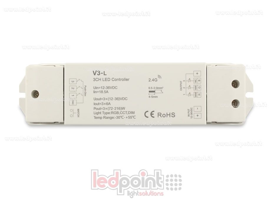 SYSTÈMES SKYDANCE CATALOGUE FAQ Récepteur RF LED 3 canaux RGB, CCT e monochromatique, associable à tous les télécommandes RF monochromatiques, CCT et RGB. Un contrôleur peut être accouplé à 10 télécommandes. Possibilité de connecter 3 interrupteurs extèrne pour avoir la fonction on/off et variateur sur chaque canal.
